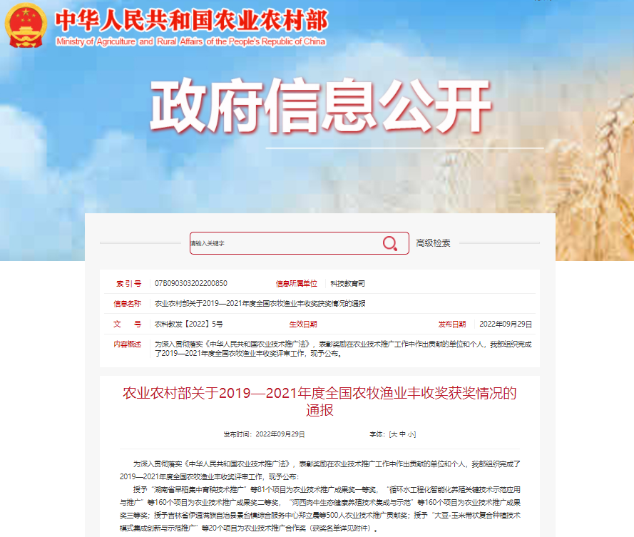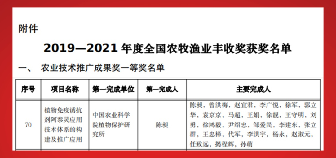 9月29日,農(nóng)業(yè)農(nóng)村部官網(wǎng)通報了“2019-2021年度全國農(nóng)牧漁業(yè)豐收獎”獲獎名單,中國農(nóng)科院植保所中保集團(tuán)陳昶團(tuán)隊的“植物免疫誘抗劑阿泰靈應(yīng)用技術(shù)體系的構(gòu)建及推廣應(yīng)用”項目,榮獲農(nóng)業(yè)技術(shù)推廣成果獎一等獎。