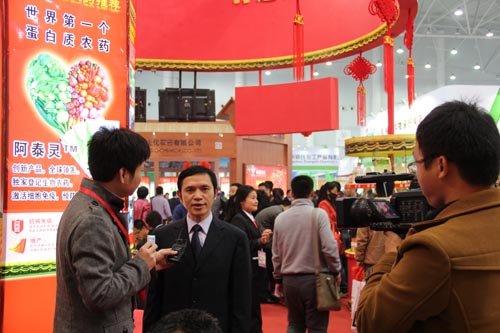 中保集團常務(wù)副總經(jīng)理陳昶研究員在展會現(xiàn)場接受了湖北電視臺農(nóng)商頻道記者的采訪。陳總就世界首個蛋白質(zhì)生物農(nóng)藥——“阿泰靈”產(chǎn)品做了介紹,從對國家先進科技成果進行產(chǎn)業(yè)化轉(zhuǎn)化的角度對植物免疫誘抗技術(shù)進行了詮釋。