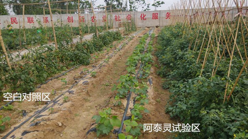 通過觀察試驗(yàn)作物發(fā)現(xiàn),阿泰靈試驗(yàn)組中的圣女果長勢明顯優(yōu)于空白對照,并且葉片濃綠、厚實(shí),果實(shí)則掛滿了枝條,一串串、沉甸甸。而空白對照組所表現(xiàn)則不盡人意,葉片發(fā)黃,果實(shí)還沒有完成成熟就出現(xiàn)明顯的早衰現(xiàn)象,并且葉片皺皺巴巴,甚至出現(xiàn)萎鄢現(xiàn)象,有明顯的番茄病毒病癥狀和枯萎病跡象。在黃豆試驗(yàn)組也得到了同樣的驗(yàn)證(具體詳見試驗(yàn)圖片)。