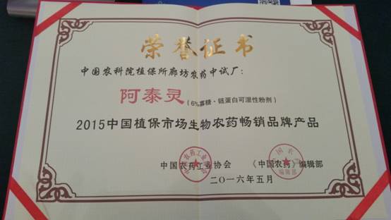 阿泰靈榮獲生物農藥暢銷品牌產品第一名