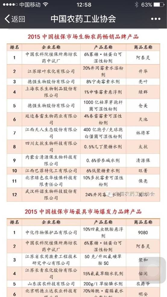 本屆頒獎大會中保集團共榮獲三項獎勵:創(chuàng)制型植物免疫蛋白質生物農藥——阿泰靈(6%寡糖·鏈蛋白)榮獲“2015中國植保市場生物農藥暢銷品牌產品”第一名、“2015中國植保市場最具市場爆發(fā)力品牌產品”第二名;同時,中保集團也榮獲“中國農藥行業(yè)制劑銷售50強”。這三項榮譽的獲得,體現(xiàn)了中國農科院植保所中保集團一年來為生物農藥推廣應用及中國農藥工業(yè)健康發(fā)展所做出的貢獻和取得的成就。