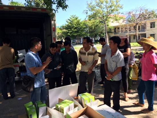 集團公司海南區(qū)域經(jīng)理田生榮攜海南區(qū)域團隊同三亞豐茂同和總經(jīng)理黃光輝隨同扶貧工作組負責人來到天涯區(qū)鄉(xiāng)村進行農(nóng)資產(chǎn)品的派送。據(jù)悉,本次扶貧農(nóng)資主要以“阿泰靈”為主,派送期間,田經(jīng)理還現(xiàn)場講解作物栽培管理及病蟲害防治等相關(guān)植保知識以及創(chuàng)制型植物免疫蛋白質(zhì)生物農(nóng)藥“阿泰靈”的產(chǎn)品特性和使用方法,指導(dǎo)農(nóng)戶用“好藥”,用好“藥”。